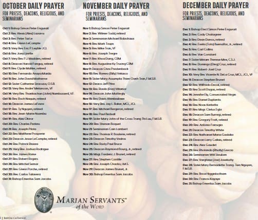 Lord Jesus, hear our prayer for the spiritual renewal of bishops, priests, deacons, brother, sisters, lay ministers and seminarians of the Diocese of Houma-Thibodaux. We praise You for giving their ministry to the Church. In these days, renew them with the gifts of Your Spirit.