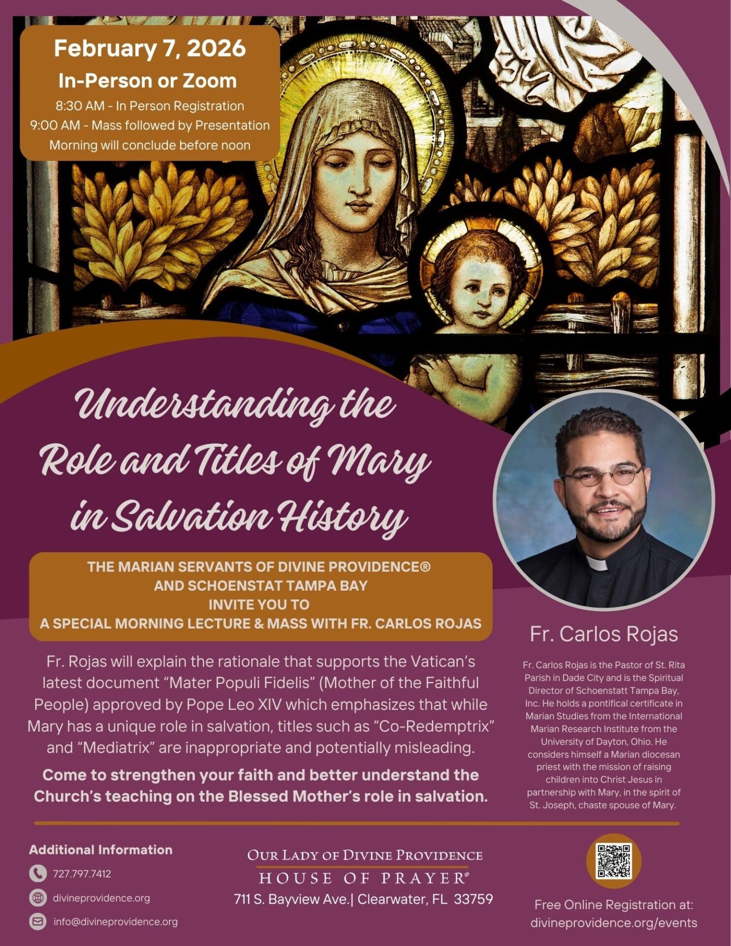Fr. Rojas will explain the rationale that supports the Vatican’s latest document “Mater Populi Fidelis” (Mother of the Faithful People) approved by Pope Leo XIV which emphasizes that while Mary has a unique role in salvation, titles such as “Co-Redemptrix” and “Mediatrix” are inappropriate and potentially misleading.